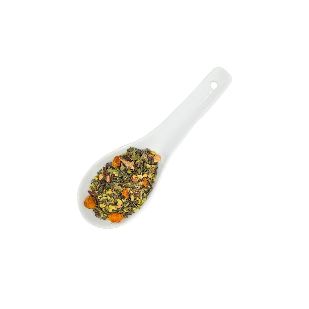 Australian Hulled Hemp Seeds, Ginger pieces, Turmeric, Peppermint leaf and Sencha Green Tea.